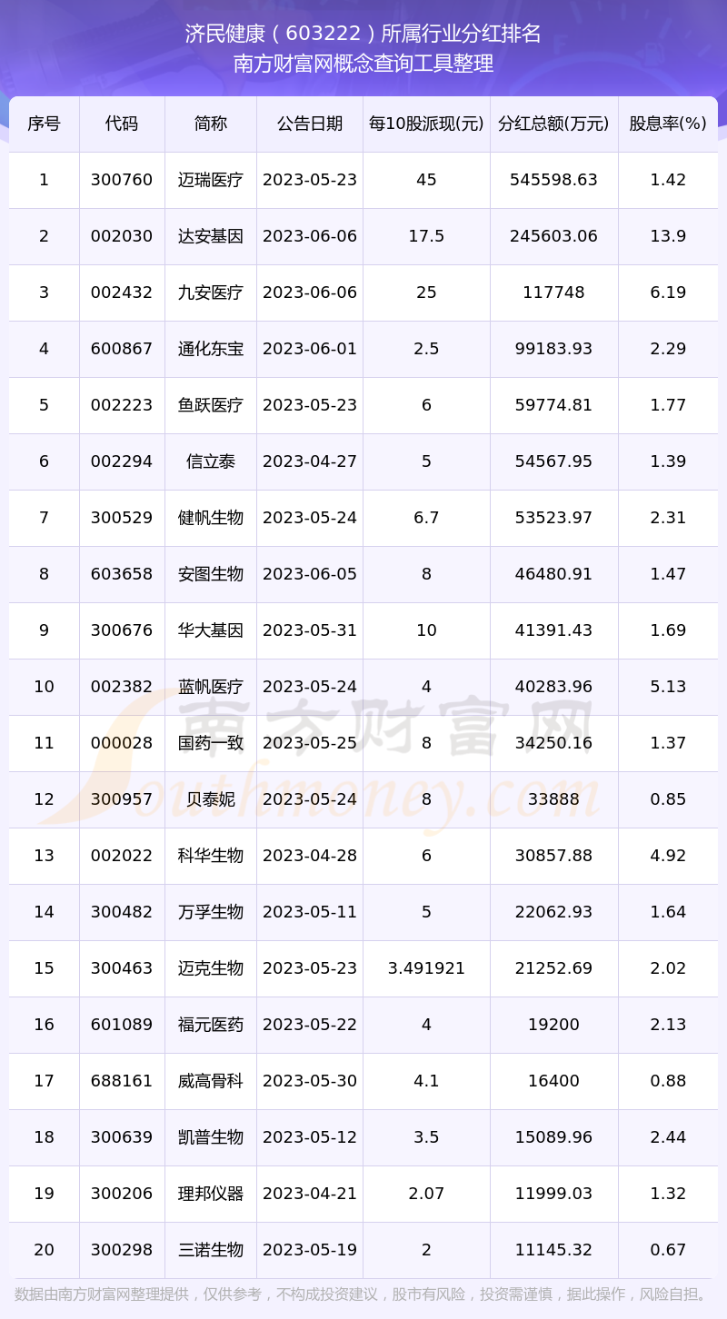 二、濟(jì)民健康603222行業(yè)分紅排名
