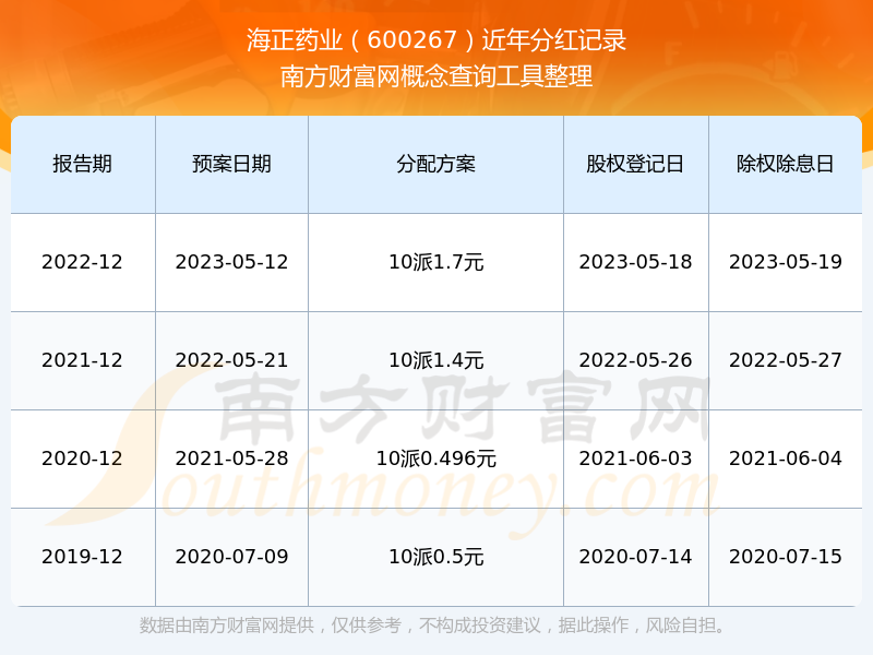 海正藥業(yè)最新一次公布的分紅方案為10派1.7元。本次權益分派股權登記日為2023年5月18日,除權除息日為2023年5月19日,派息日為2023年5月19日。