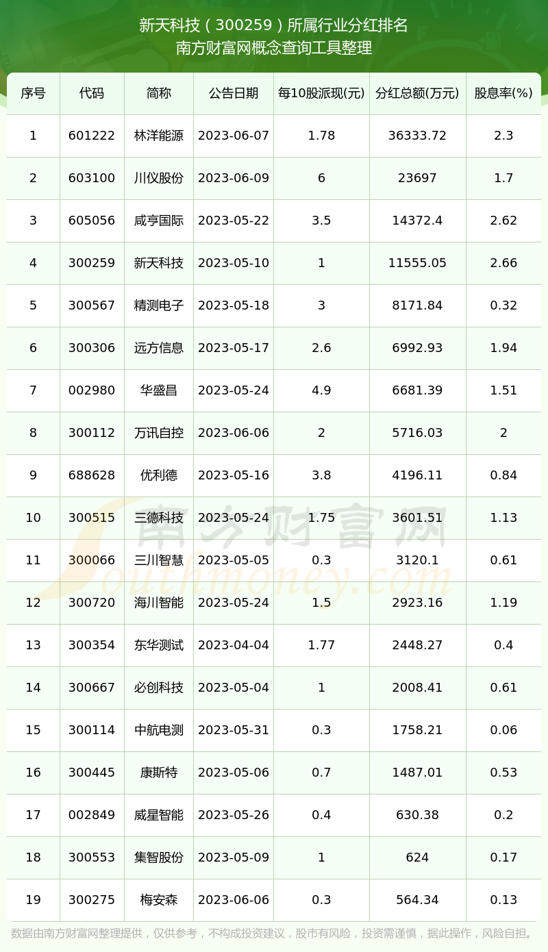 按照南方財富網(wǎng)趨勢選股系統(tǒng)統(tǒng)計,新天科技所屬行業(yè)為智能水表行業(yè),智能水表行業(yè)分紅排名情況如下表: