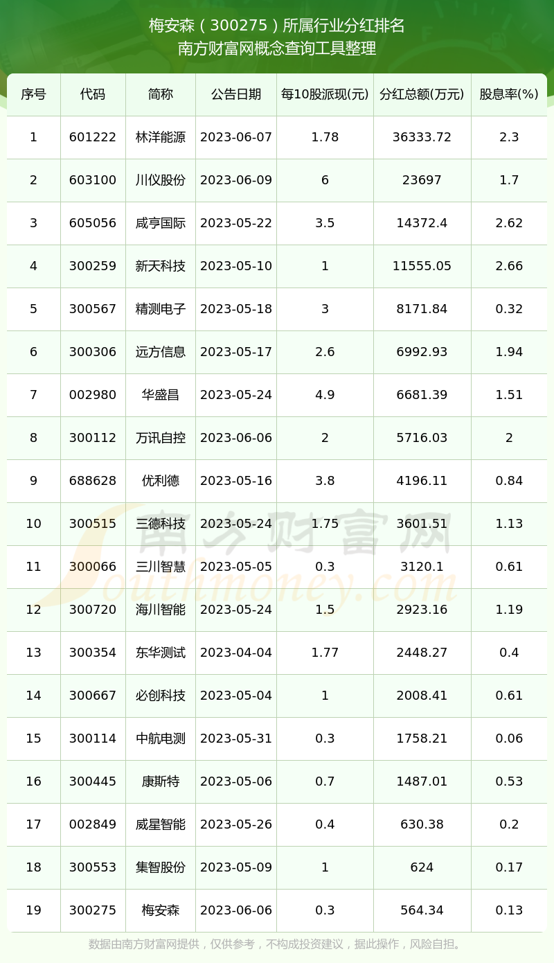 按照南方財富網(wǎng)趨勢選股系統(tǒng)統(tǒng)計,梅安森所屬行業(yè)為儀器儀表行業(yè),儀器儀表行業(yè)分紅排名情況如下表: