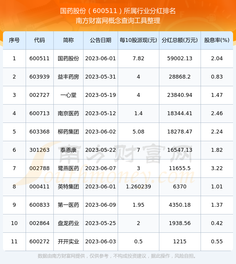 按照南方財(cái)富網(wǎng)趨勢(shì)選股系統(tǒng)統(tǒng)計(jì),國藥股份所屬行業(yè)為醫(yī)藥商業(yè)行業(yè),醫(yī)藥商業(yè)行業(yè)分紅排名情況如下表: