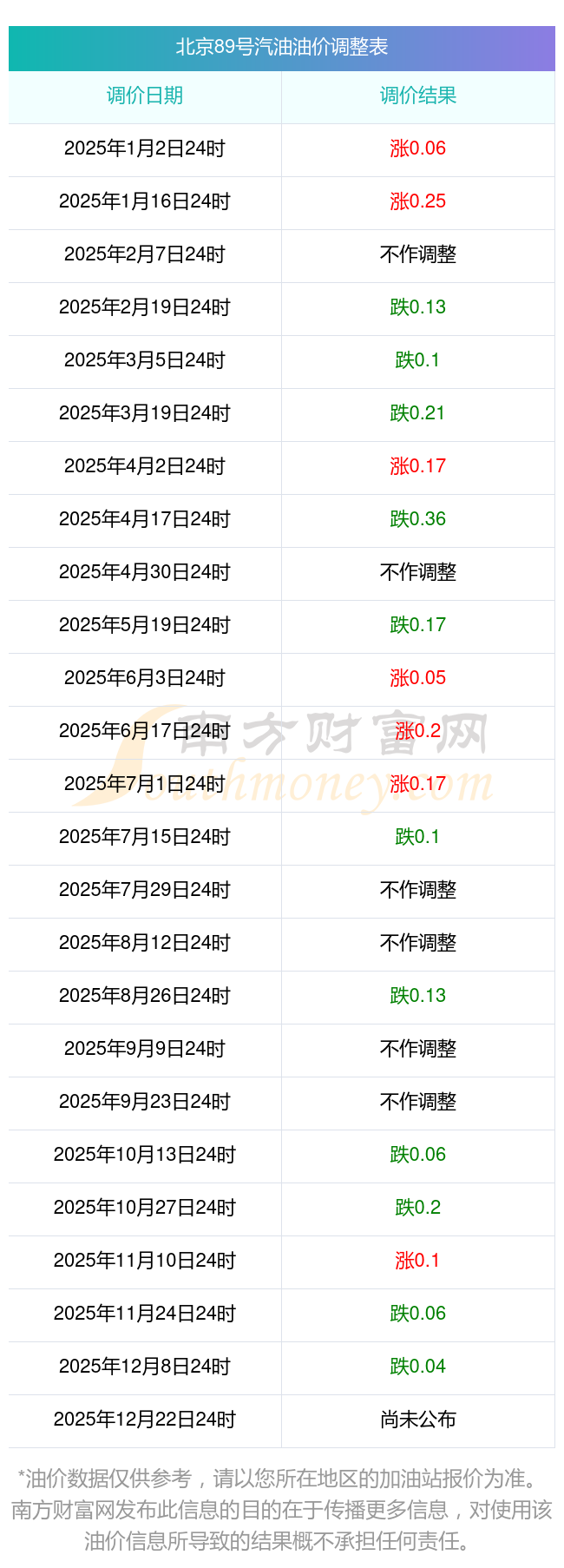 以上數(shù)據(jù)僅供參考,請以您所在地區(qū)的加油站實際售價為準(zhǔn)。南方財富網(wǎng)發(fā)布此信息的目的在于傳播更多信息,對使用該油價信息所導(dǎo)致的結(jié)果概不承擔(dān)責(zé)任。