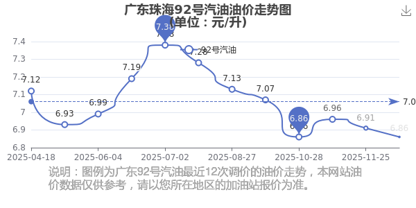 汽油、柴油12月22日價格多少錢一升?具體為:0號柴油為6.49元,下調(diào)了0.04元;95號汽油為7.43元;92號汽油為6.86元;89號汽油為6.37元,調(diào)整時間為12月9日。下一輪油價調(diào)整時間12月22日24時,距離現(xiàn)在還有0.45天。
