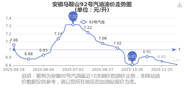 12月22日安徽馬鞍山92號(hào)汽油的價(jià)格為12月9日調(diào)整后的價(jià)格,具體為:6.81元每升,相對(duì)上次調(diào)整時(shí)間11月25日的油價(jià)6.85元每升,下調(diào)了0.04元,下調(diào)幅達(dá)0.584%。
