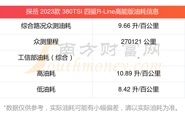 根據(jù)車主實(shí)測(cè)數(shù)據(jù),該車型低油耗為8.42L/100km,高油耗為10.89L/100km,綜合路況眾測(cè)油耗為9.66L/100km,工信部綜合油耗為-L/100km。