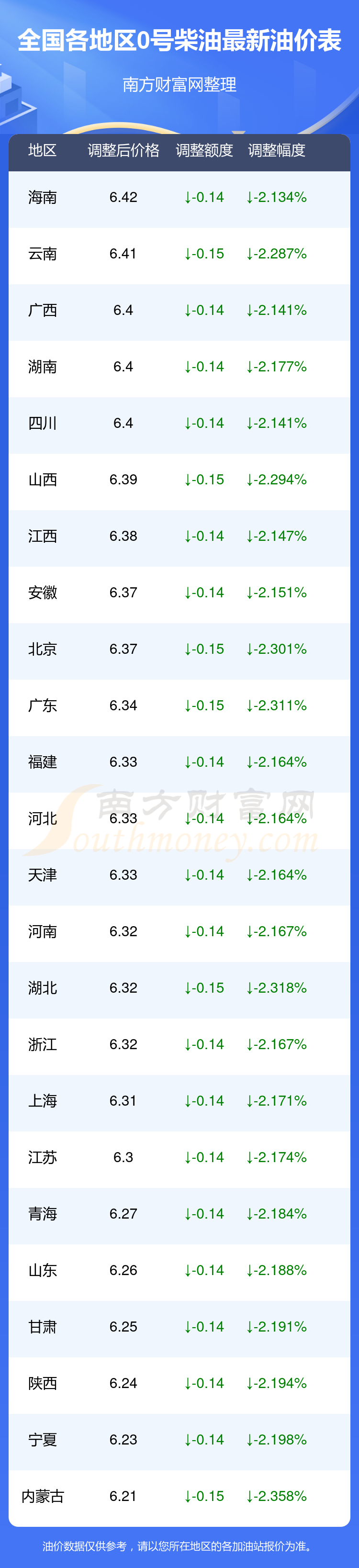 全國(guó)各地區(qū)最新0號(hào)柴油油價(jià)表