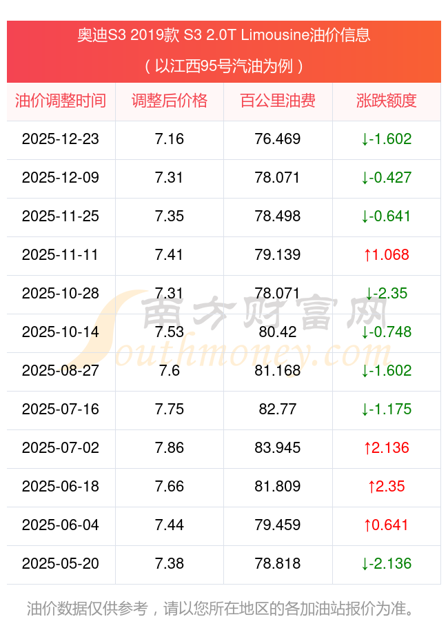 按照12月23日95號(hào)汽油最新調(diào)整價(jià)格7.16元/升來(lái)計(jì)算(以江西為例),該車(chē)型百公里平均油費(fèi)為76.469元,按照上一輪12月9日調(diào)整價(jià)格7.31元/升來(lái)計(jì)算,百公里平均油費(fèi)為78.071元,對(duì)比上一輪少花1.602元,下一輪油價(jià)調(diào)整時(shí)間為12月31日24時(shí)。