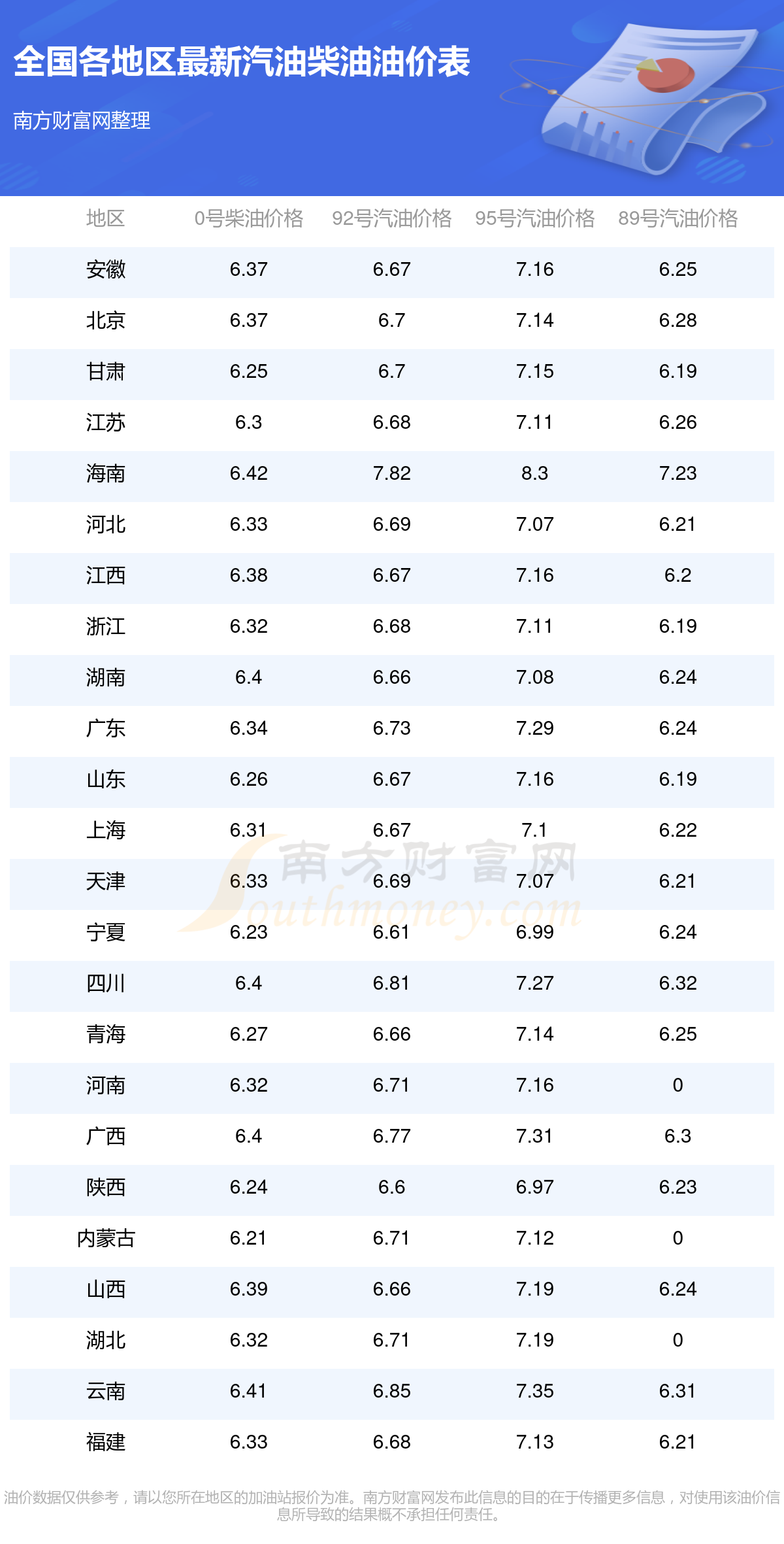 以上數(shù)據(jù)僅供參考,請以您所在地區(qū)的加油站實際售價為準(zhǔn)。南方財富網(wǎng)發(fā)布此信息的目的在于傳播更多信息,對使用該油價信息所導(dǎo)致的結(jié)果概不承擔(dān)責(zé)任。