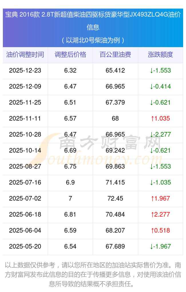 該車型目前采用的是2.8T109馬力L4渦輪增壓發(fā)動機,5擋手動擋的變速箱,按0號柴油當(dāng)前最新價格6.32元/升來計算(以湖北為例),平均油費為0.65412元每公里。廠家參考價為9.88萬元。