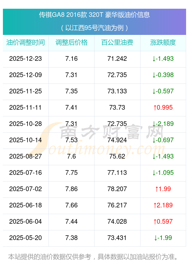 依照12月23日95號汽油最新調整價格7.16元/升來計算(以江西為例),該車型百公里的平均油費是71.242元,依照上一輪12月9日調整價格7.31元/升來計算,百公里的平均油費是72.735元,對比上一輪少花1.493元,下一輪的油價調整時間12月31日24時。