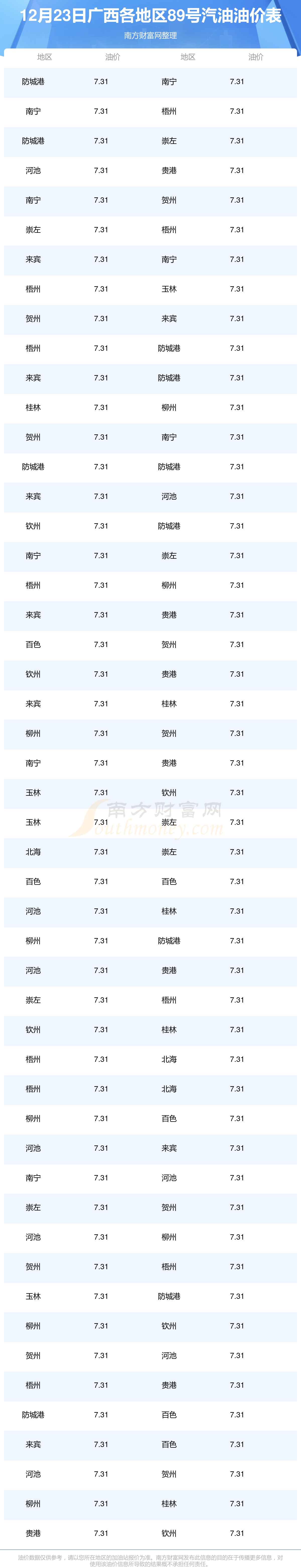 廣西各地區(qū)最新89號(hào)汽油油價(jià)表