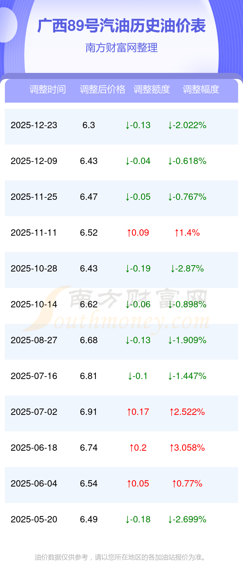 12月23日廣西89號(hào)汽油價(jià)格為6.3元每升,本次調(diào)整時(shí)間為12月23日,相對(duì)上次減了0.13元,減2.022%。