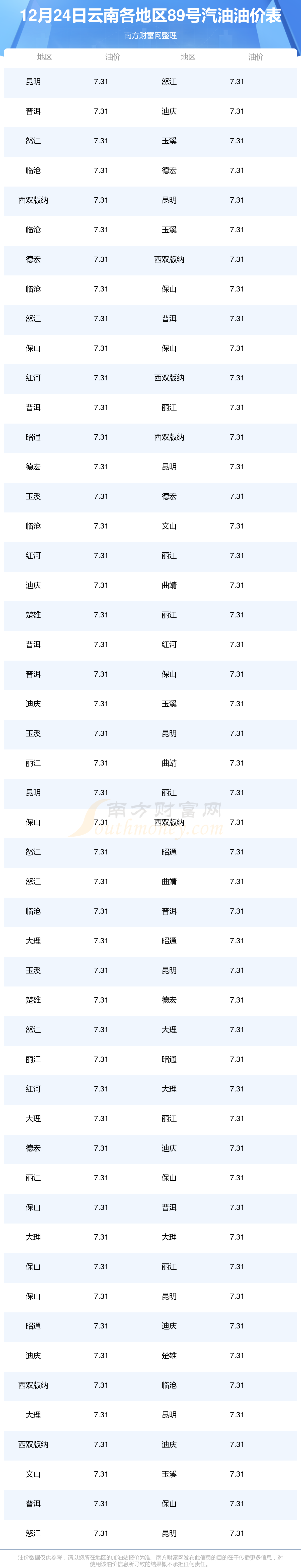 12月24日云南89號汽油價格為6.31元每升,本次調(diào)整時間為12月23日,相對上次調(diào)整后12月9日的油價6.43元每升,降了0.12元,降幅達1.866%。
