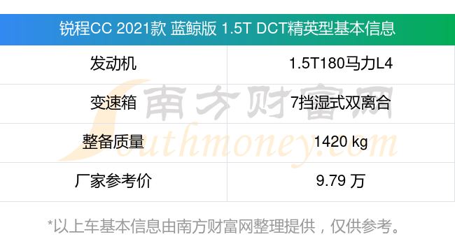 在動力上,銳程CC 2021款 藍鯨版 1.5T DCT精英型配備的是一臺1.5T180馬力L4渦輪增壓發(fā)動機,匹配的是7擋濕式雙離合自動檔變速箱,燃料形式為汽油,常規(guī)整備質(zhì)量1420kg,廠家參考價9.79萬元。