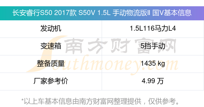 長(zhǎng)安睿行S50 2017款 S50V 1.5L 手動(dòng)物流版Ⅱ 國(guó)V動(dòng)力上搭載的是一臺(tái)1.5L116馬力L4自然吸氣發(fā)動(dòng)機(jī),匹配5擋手動(dòng)擋變速箱,燃料形式為汽油,常規(guī)整備質(zhì)量1435kg,廠家參考價(jià)4.99萬(wàn)元。