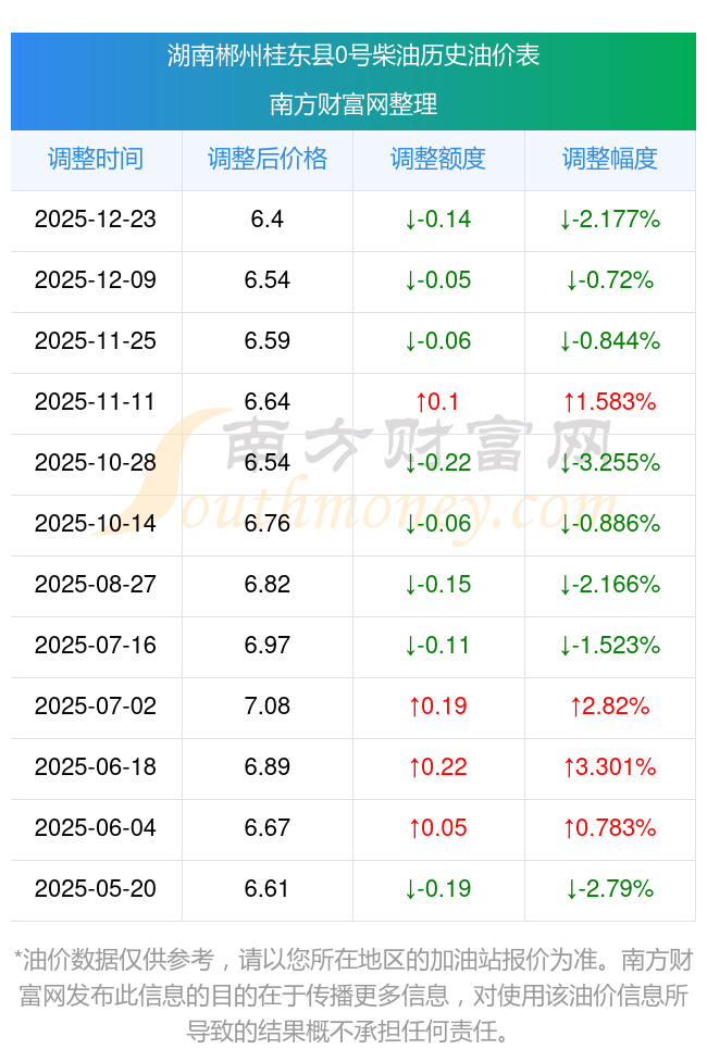 湖南郴州桂東縣0號(hào)柴油歷史油價(jià)一覽表