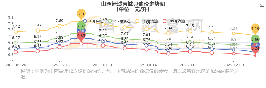 山西運(yùn)城芮城縣12月24日95號(hào)汽油歷史油價(jià)調(diào)整走勢(shì)圖