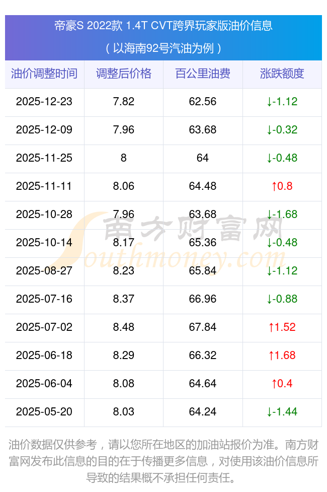 按12月23日92號汽油最新調(diào)整價格7.82元每升來計算(以海南為例),該車型百公里平均油費為62.56元,按上一輪12月9日調(diào)整價格7.96元每升來計算,百公里平均油費為63.68元,對比上一輪少花1.12元,下一輪油價調(diào)整時間為12月31日24時。