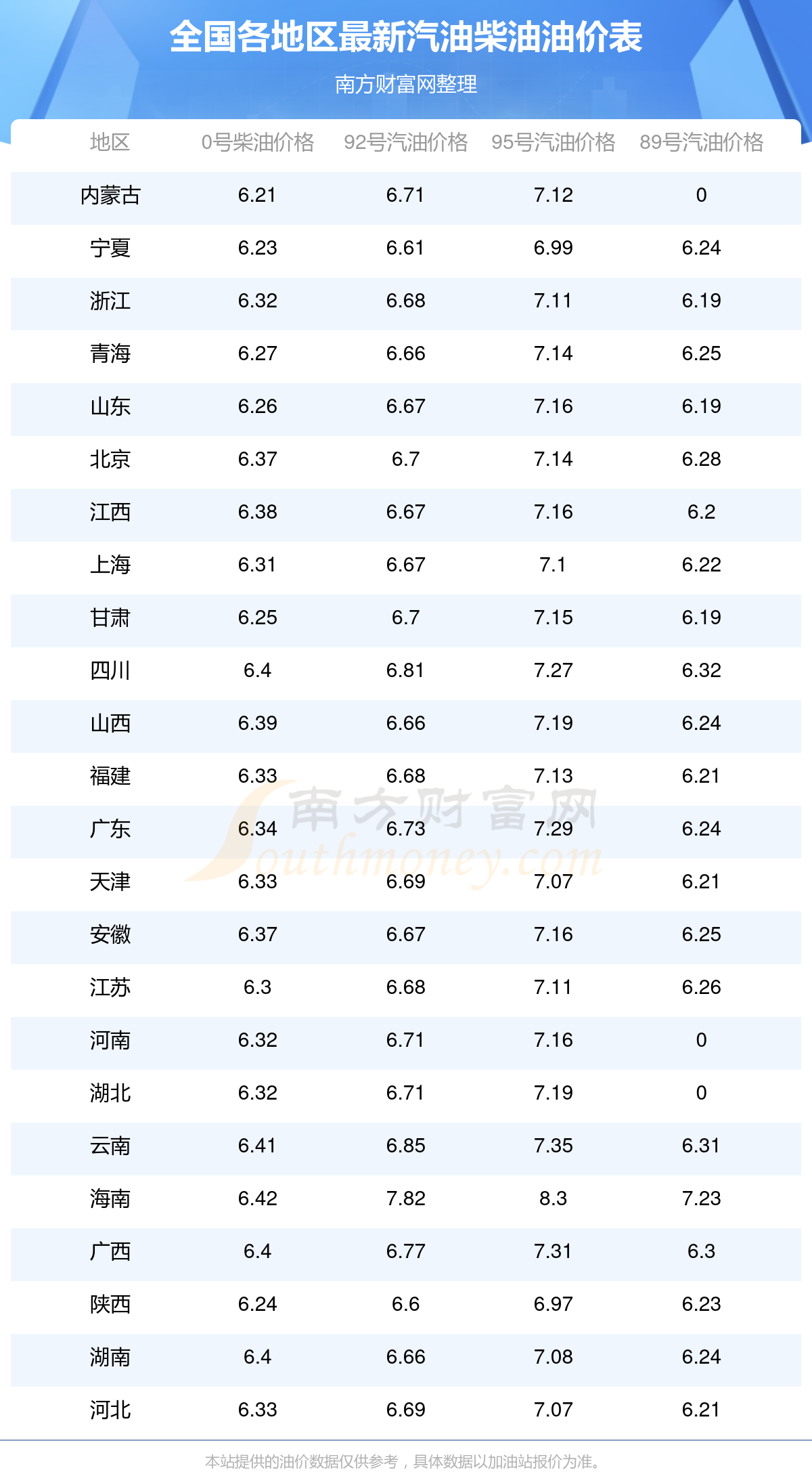 油價(jià)數(shù)據(jù)僅供參考,請(qǐng)以您所在地區(qū)的各加油站報(bào)價(jià)為準(zhǔn)。