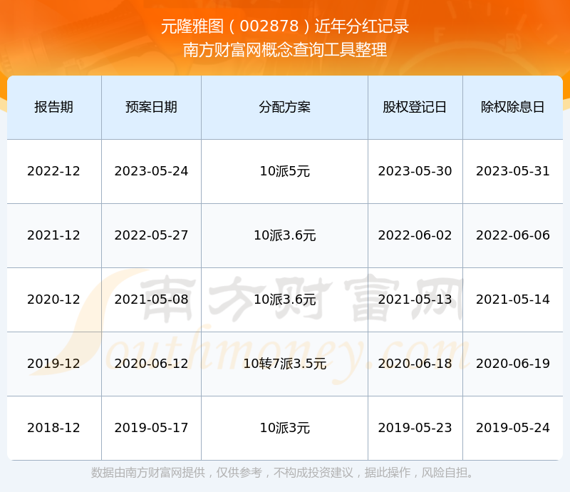 元隆雅圖最新一次公布的分紅方案為10派5元。本次權(quán)益分派股權(quán)登記日為2023年5月30日,除權(quán)除息日為2023年5月31日,派息日為2023年5月31日。