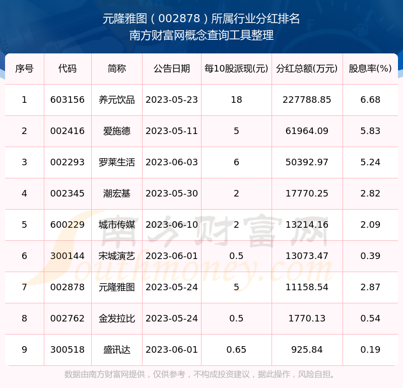 按照南方財(cái)富網(wǎng)趨勢(shì)選股系統(tǒng)統(tǒng)計(jì),元隆雅圖所屬行業(yè)為專業(yè)服務(wù)行業(yè),專業(yè)服務(wù)行業(yè)分紅排名情況如下表: