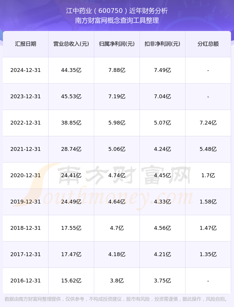 2024年報(bào)顯示,江中藥業(yè)實(shí)現(xiàn)營(yíng)收44.35億,同比增長(zhǎng)-2.59%;凈利潤(rùn)7.88億,同比增長(zhǎng)9.67%;毛利率63.52%。