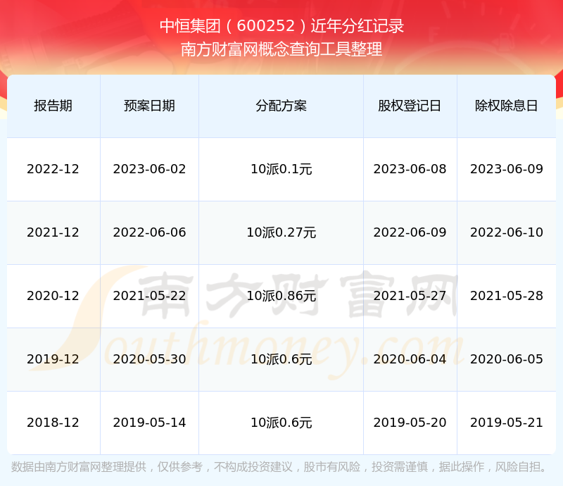 中恒集團(tuán)最新一次公布的分紅方案為10派0.1元。本次權(quán)益分派股權(quán)登記日為2023年6月8日,除權(quán)除息日為2023年6月9日,派息日為2023年6月9日。