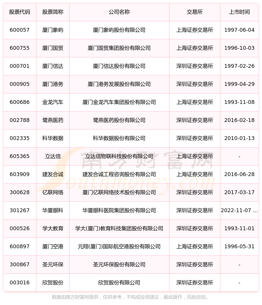 截至12月17日,廈門(mén)湖里區(qū)共有15家上市公司,南方財(cái)富網(wǎng)趨勢(shì)選股系統(tǒng)為您整理了廈門(mén)湖里區(qū)在A股上市的公司。