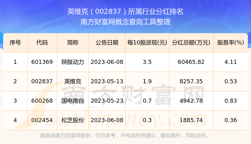 按照南方財富網(wǎng)趨勢選股系統(tǒng)統(tǒng)計,英維克所屬行業(yè)為溫控設備行業(yè),溫控設備行業(yè)分紅排名情況如下表: