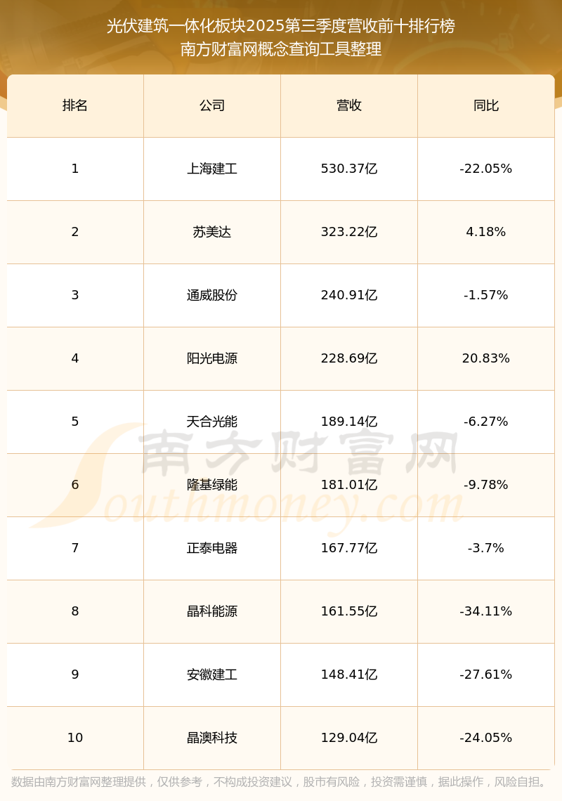 按照南方財(cái)富網(wǎng)概念查詢工具統(tǒng)計(jì),該股所屬板塊為光伏建筑一體化板塊,該板塊共有87只股票,隆基綠能2025第三季度營收在該板塊中排名為第6名,該板塊2025第三季度營收排名前十的股票如下表: