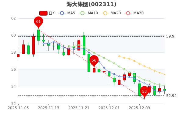 近7個交易日,海大集團(tuán)下跌3.94%,12月16日該股最高價為54.2元,總市值為890.61億元,換手率0.23%,振幅跌0.5%。