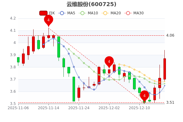 12月17日股市消息,云維股份(600725)盤中報3.840元/股,漲4.31%。公司股價沖高至3.94元,最低達3.68元,換手率1.59%。