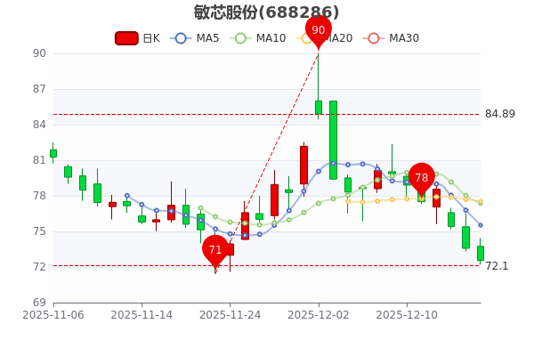 12月17日早盤最新消息,敏芯股份7日內(nèi)股價下跌6.82%,截至11時22分,該股跌1.4%報72.660元 。