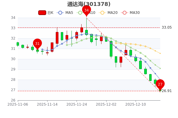 12月17日訊息,通達海3日內股價下跌5.18%,市值為26億元,跌2.54%,最新報26.910元。
