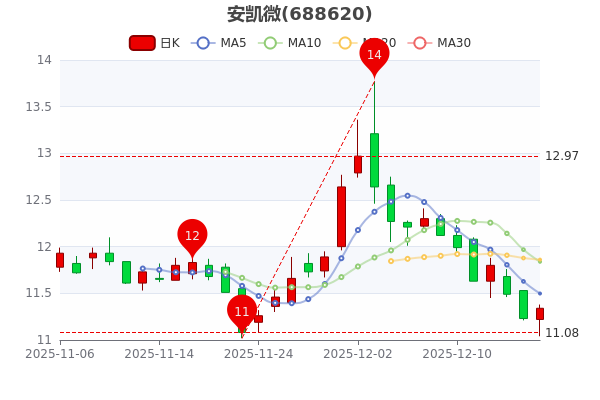 12月17日消息,安凱微收盤于11.340元,漲0.98%。7日內(nèi)股價下跌8.47%,總市值為44.45億元。