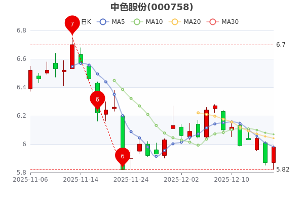 12月17日消息,中色股份(000758)開(kāi)盤(pán)報(bào)5.87元,截至15點(diǎn),該股漲1.87%報(bào)5.980元,換手率1.48% ,成交額1.73億元。