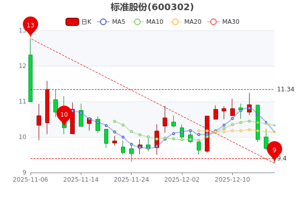 12月17日消息,標準股份截至15點,該股跌2.89%,報9.400元;5日內(nèi)股價下跌14.89%,市值為32.52億元。