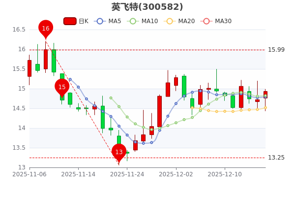 12月17日收盤消息,英飛特5日內(nèi)股價上漲0.74%,截至下午3點收盤,該股報14.930元,漲1.43%,總市值為44.57億元。