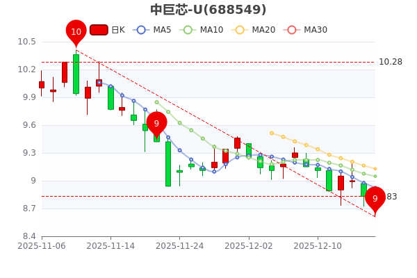 12月16日消息,中巨芯-U3日內股價下跌1.58%,最新報8.860元,跌2.78%,成交額1.52億元。