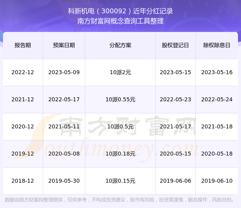 科新機電最新一次公布的分紅方案為10派2元。本次權益分派股權登記日為2023年5月15日,除權除息日為2023年5月16日,派息日為2023年5月16日。