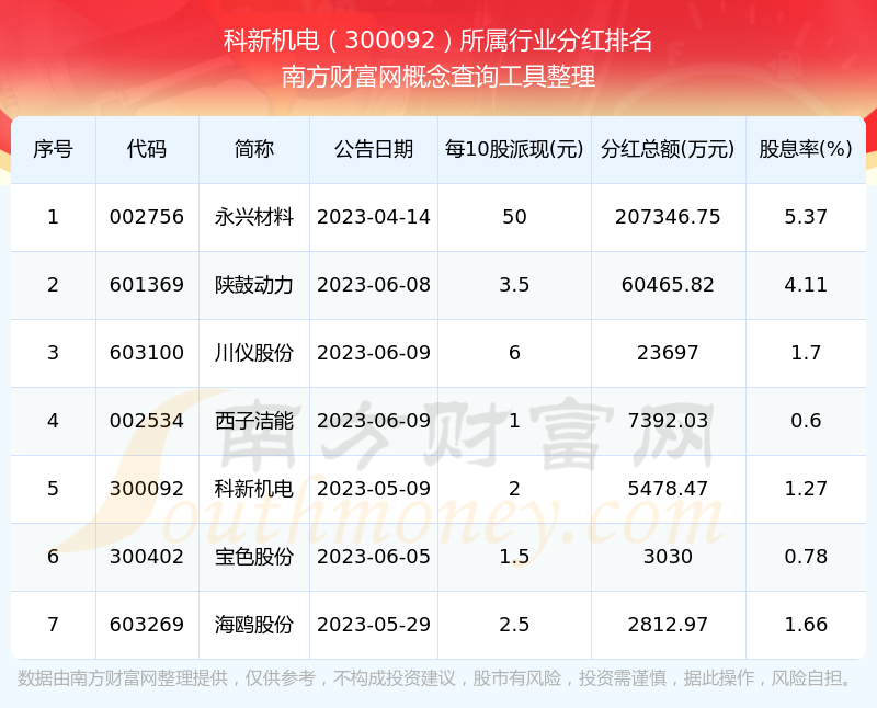 按照南方財富網(wǎng)趨勢選股系統(tǒng)統(tǒng)計,科新機電所屬行業(yè)為氫能源行業(yè),氫能源行業(yè)分紅排名情況如下表:
