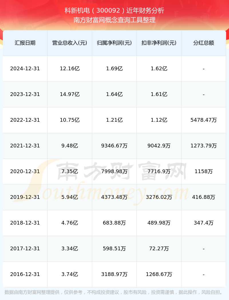 科新機電公司2024年實現(xiàn)營業(yè)收入12.16億元,同比增長-18.79%;凈利潤1.69億元,同比增長3.54%;毛利率27.85%。