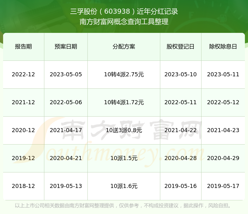三孚股份最新一次公布的分紅方案為10轉(zhuǎn)4派2.75元。本次權(quán)益分派股權(quán)登記日為2023年5月10日,除權(quán)除息日為2023年5月11日,派息日為2023年5月11日。