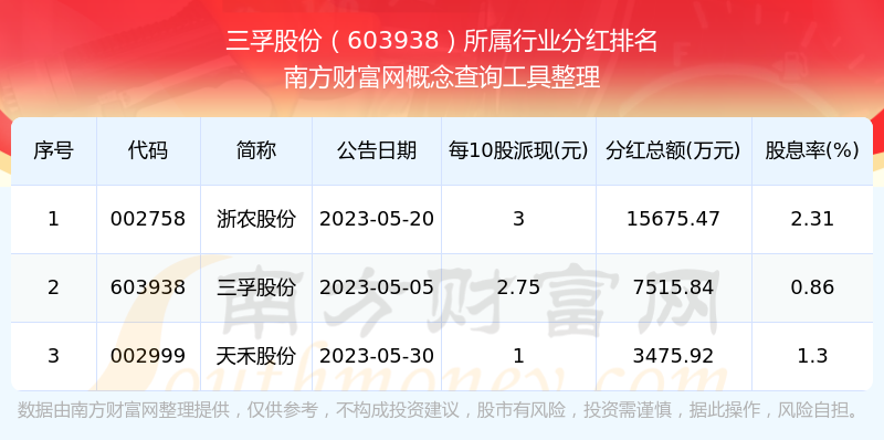 按照南方財富網(wǎng)趨勢選股系統(tǒng)統(tǒng)計,三孚股份所屬行業(yè)為有機硅行業(yè),有機硅行業(yè)分紅排名情況如下表: