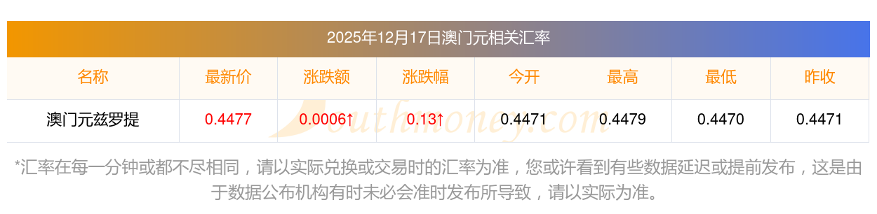 根據(jù)2025年12月17日匯率,澳門元兌換茲羅提匯率最新0.447700,今開0.4471,昨收0.4471,最高0.4479,最低0.4470。