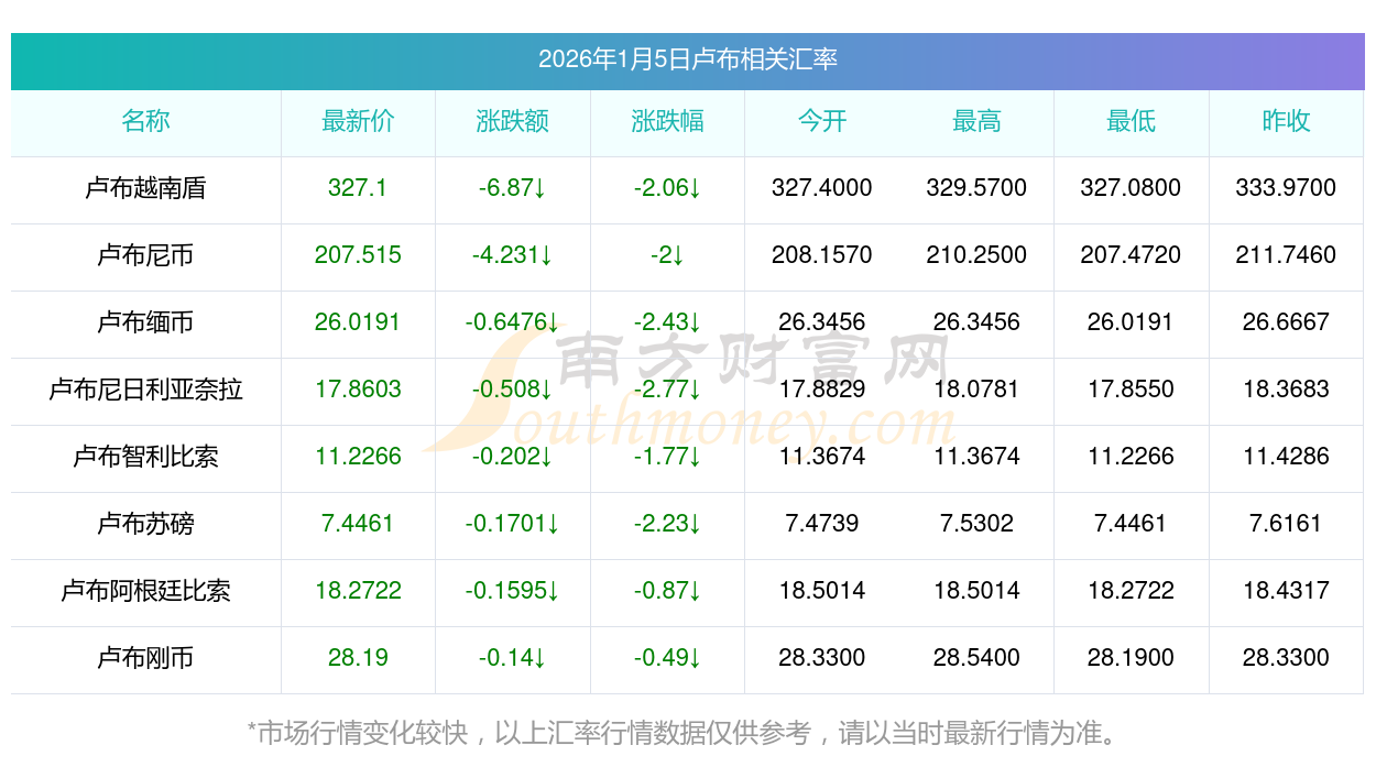 2026年1月5日最新消息,盧布兌換瑞典克朗最新匯率為0.114300,今開為0.1148,昨收為0.1170,最高為0.1162,最低為0.1142。