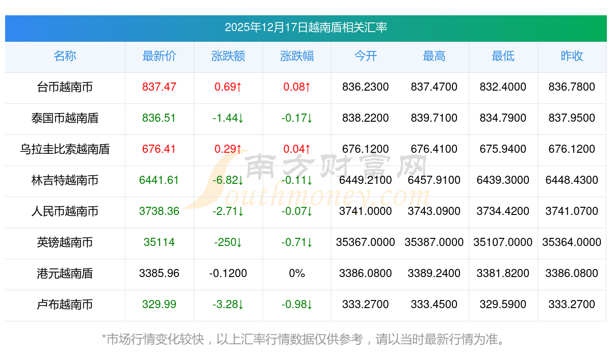 根據(jù)今天2025年12月17日匯率計算,VND兌換CZK匯率最新價0.000790,今開價0.0008,昨收價0.0008,最高價0.0008,最低價0.0008。