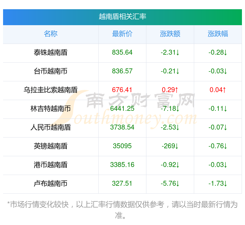 南方財(cái)富網(wǎng)為您提供越南盾對(duì)波幣匯率最新價(jià)格詳情。