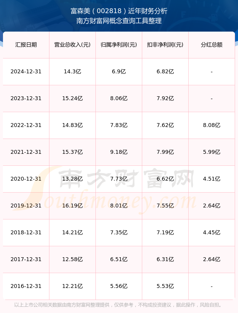 富森美2024年總營收14.3億,同比增長-6.18%;凈利潤6.9億,同比增長-14.39%;銷售毛利率67.24%。