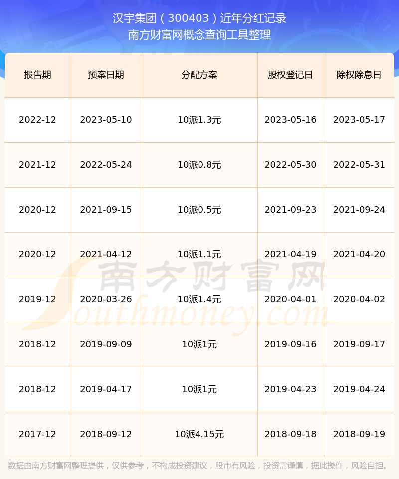 漢宇集團(tuán)最新一次公布的分紅方案:10派1.3元。